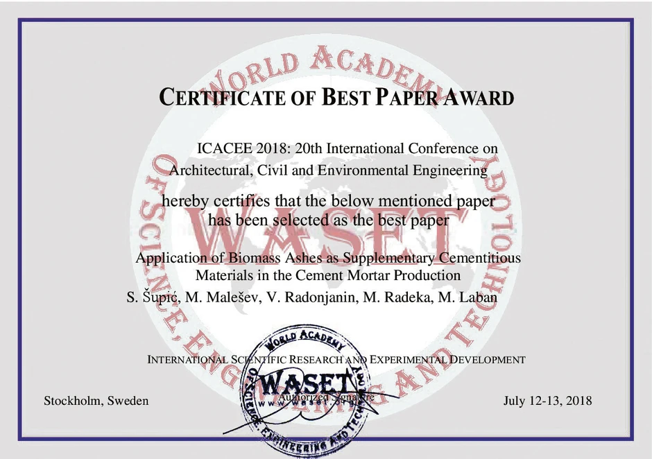 Njihova istraživanja pokazala su da pepeo može zameniti cement u malteru sa oko 30 odsto, a u betonu čak 50. Ubrzo je ovo rešenje dobilo pažnju i u svetu, na građevinskoj konferenciji "ICACEE 2018: Architectural, Civil and Environmental Engineering" u Stokholmu. Između 162 rada naučnika od Australije do Kanade istraživanje o održivom korišćenju pepela nastalog sagorevanjem biomase u Vojvodini u građevinskim proizvodima osvojilo je prvo mesto.