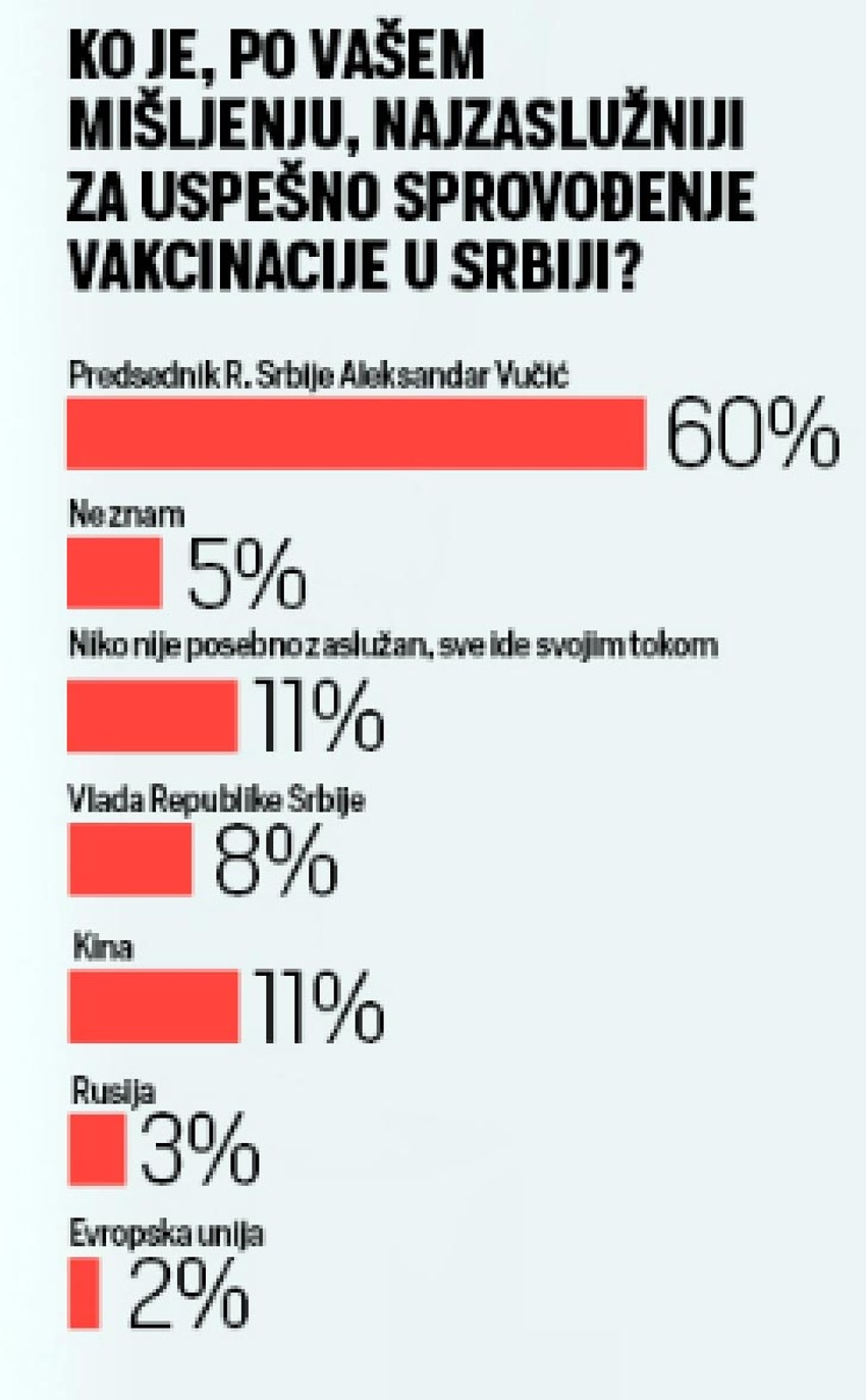 Na pitanje ko je najzaslužniji za uspešno sprovođenje vakcinacije u Srbiji, građani su u najvećem procentu rekli da je to predsednik Aleksandar Vučić - čak 60 procenata, 11 odsto kaže da zasluge nosi Kina, 8 odsto kaže da je dobra vakcinacija posledica rada Vlade Srbije, 3 odsto da je zaslužna Rusija, a 2 da je u pitanju Evropska unija. Da niko nije posebno zaslužan, već da sve ide svojim tokom, navodi kao odgovor 11 odsto ispitanika, dok se pet procenata izjasnilo da ne zna.