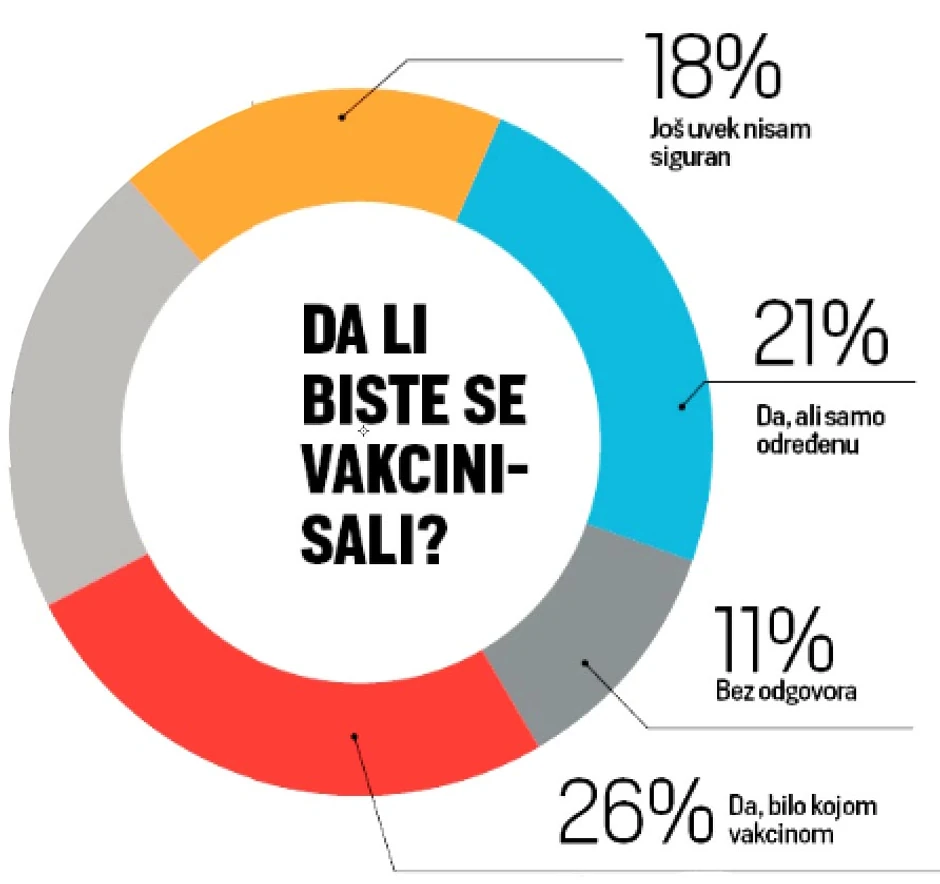 Četvrtina građana odgovorila je da bi se vakcinisala bilo kojom vakcinom, dok 21 procenat kaže da bi primio samo određenu vakcinu. Skoro petina građana ili 18 odsto nije sigurno da li bi primilo vakcinu, 24 procenta kaže da ne bi, a odgovor nije dalo 11 odsto ispitanika.