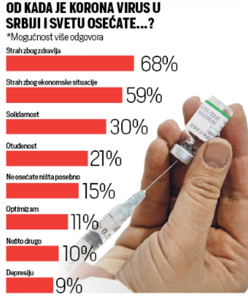 Na pitanje šta osećaju od kada se korona pojavila u zemlji i svetu, uz mogućnost zaokruživanja više odgovora, 68 odsto reklo je da strahuje za zdravlje, 59 odsto se plaši ekonomskog razvoja situacije, 30 odsto oseća solidarnost, 21 procenat otuđenost, 11 optimizam, a 9 odsto depresiju.