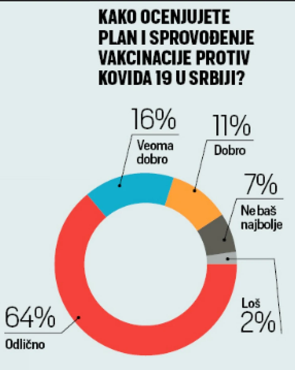 Čak 64 odsto ispitanika taj plan ocenjuje odlično, 16 kao veoma dobar, 11 kao dobar, 7 procenata kaže da nije baš najbolji, a samo 2 odsto kaže da je plan loš.