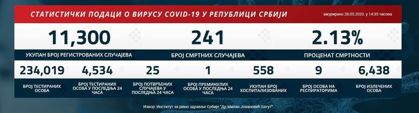 U protekla 24 sata u Srbiji je na korona virus testirano 4.534 osoba, registrovano je 25 novozaraženih, a jedna osoba je umrla, čime je ukupan broj preminulih dostigao 241.