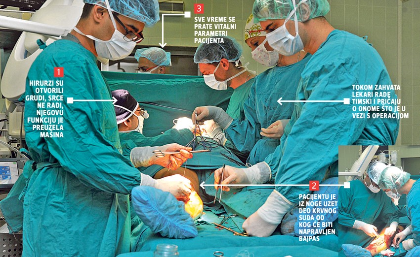 - Potrajaće četiri, četiri i po sata. Radićemo veoma komplikovanu operaciju, ugradnju dvostrukog bajpasa, prišiti dva grafta na arterije srca - u hodu nam priča dr Grujić, subspecijalista kardiohirurgije. Tim je na okupu, atmosfera opuštena, ali sa merom jer svaka greška...