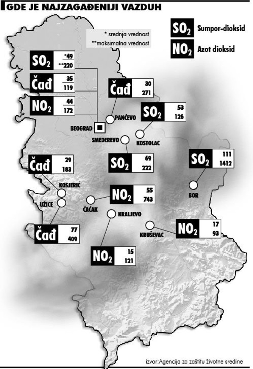 Ipak, Bor se smatra crnom tačkom po zagađenosti sumpor-dioksidom. Užice je na neslavnom prvom mestu po zagađenosti čađi, a veliki gradovi kao što su Beograd, Novi Sad, Niš, Čačak izdvajaju se po zagađenosti azotnim oksidima, pre svega zbog gustine saobraćaja.