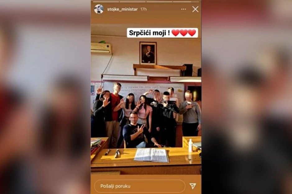 Nastavnik na zameni u školi koju pohađaju deca različitih nacionalnosti, slikao se sa decom srpske nacionalnosti sa podignuta tri prsta, a zatim je tu fotografiju podelio na svom Instagram nalogu uz opis "Srpčići moji".