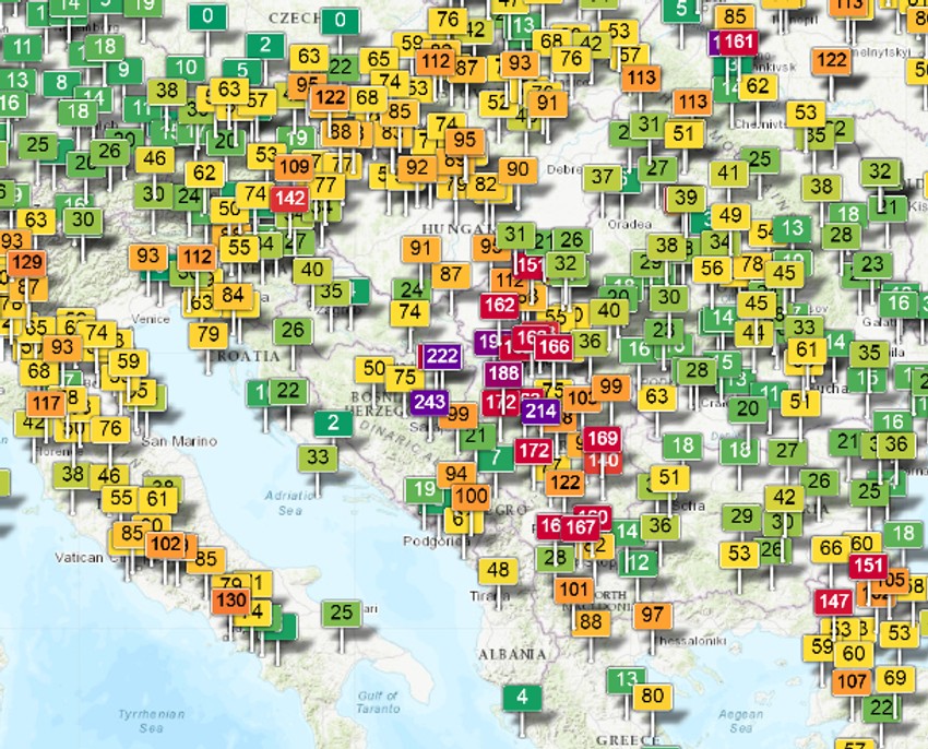 To se jasno vidi na mapi sajta "WAQI" koji meri trenutno aerozagađenje u svetu, te dok su komšije većinom u žutoj i zelenoj zoni, odnosno zagađenje vazduha se ocenjuje kao "umereno" i "dobro", najveći deo naše zemlje označen je crvenom i ljubičastom bojom što na skali zagađenja predstavlja "nezdrav" i "veoma nezdrav" vazduh.