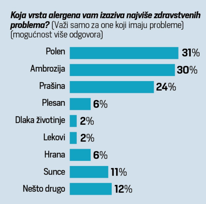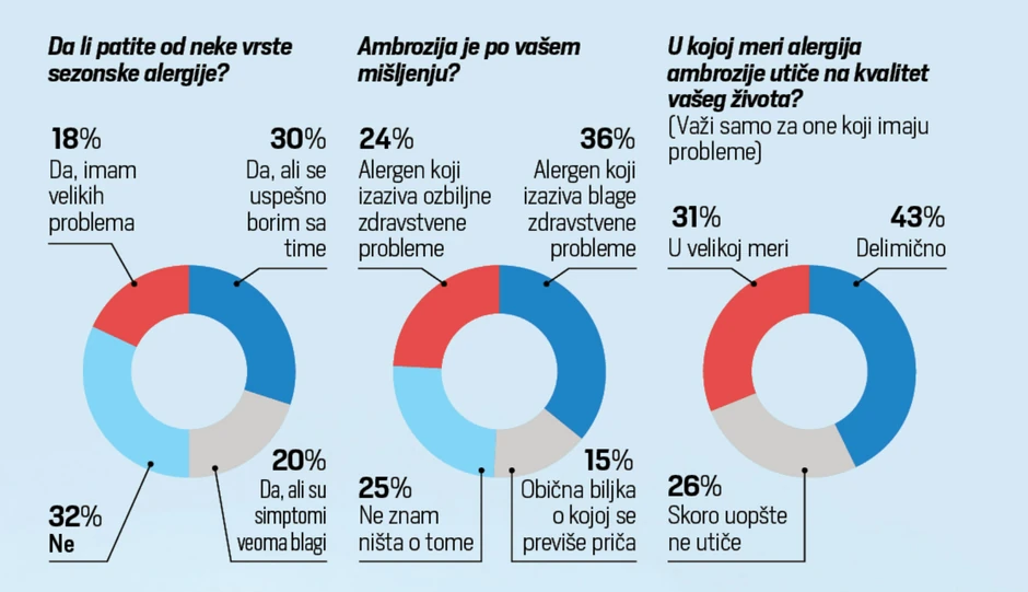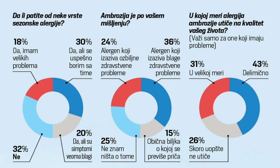 Gotovo 70 odsto građana Srbije pati od neke vrste sezonskih alergija, a 30 odsto njih ima alergiju na polen ambrozije. Kod više od 64 odsto alergija u velikoj meri ili delimično utiče na kvalitet života, a 36 odsto ljudi uzima lekove na svoju ruku.