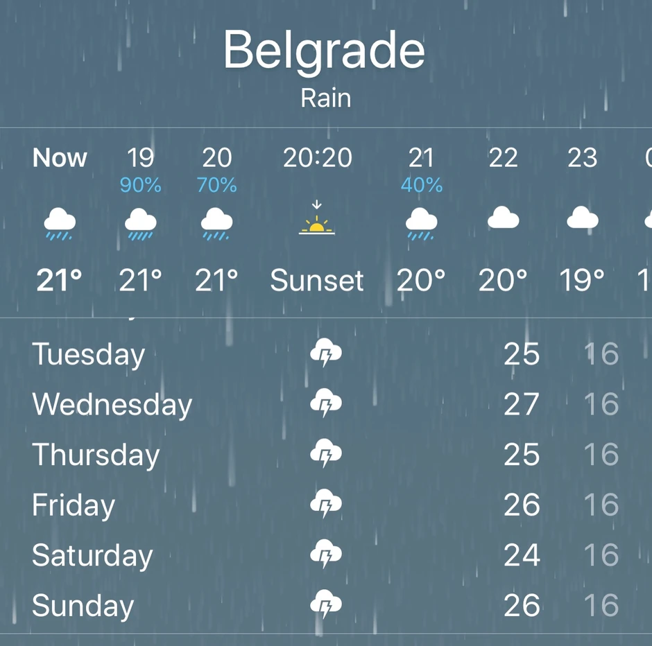 Pogled na aplikaciju za vremensku prognozu je krajnje sumoran. Vikend, ali i početak sledeće nedelje doneće visoku vlažnost, nestabilno vreme sa kišom i grmljavinom.