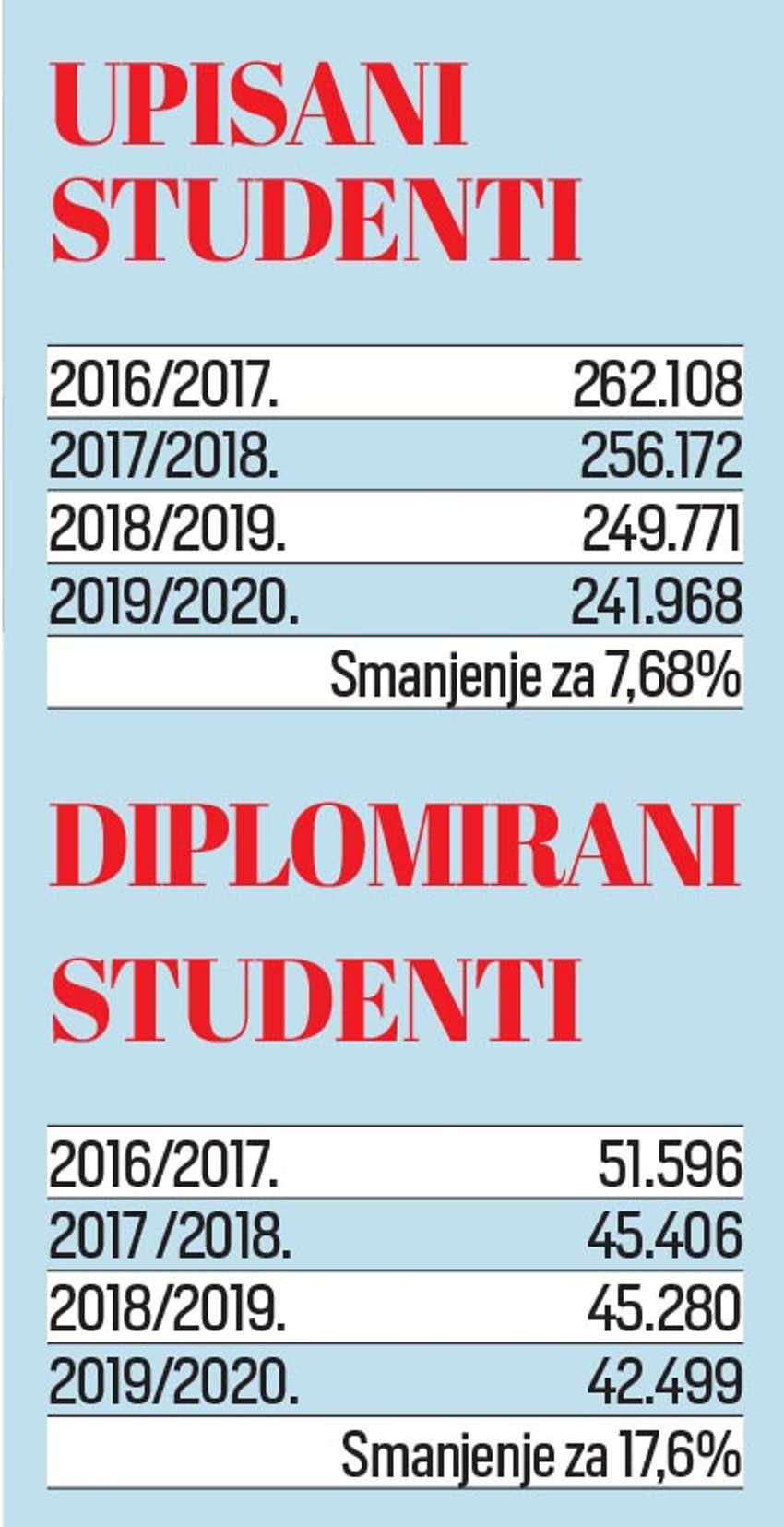 Najnoviji podaci Republičkog zavoda za statistiku Srbije pokazali su da je za samo tri školske godine broj upisanih studenata na državne i privatne fakultete smanjen za skoro 10 odsto, a diplomiranih za skoro 20 odsto.