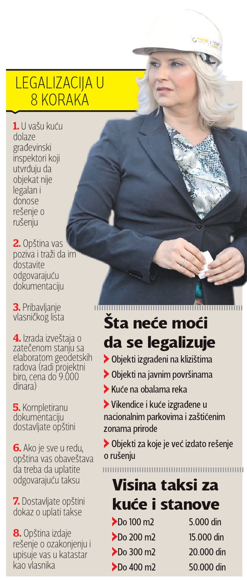 Ipak, oni koji odsad budu gradili bez dozvole neće imati nikakvu šansu da legalizuju te objekte. Državi će u otkrivanju takvih objekata pomoći satelitski snimak terena na kojem su zabeleženi svi objekti koji postoje u datom trenutku.