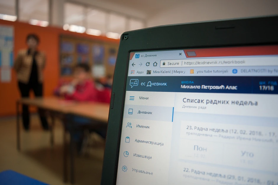 Jedna od škola u kojoj već šest meseci umesto sa dnevnikom u ruci učitelji i nastavnici ulaze sa laptopom je beogradska OŠ „Mihailo Petrović Alas”. Da bi pristupili e-dnevniku, zaposlenima je neophodan internet i računar, a svako ima i svoju šifru.