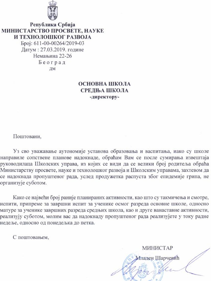 Kako dalje piše, "kako se najveći broj ranije planiranih aktivnosti, kao što su takmičenja i smotre, ispiti, pripreme za završrni ispit za učenike osmog rarzeda osnovne škole, odnosno mature za učenike završnih razreda srednjih škola, kao i druge vannastavne aktivnosti, realizuju subotom, molim vas da nadoknadu propuštenog rada realizujete u toku radne nedelje, odnonsno od ponedeljka do petka".