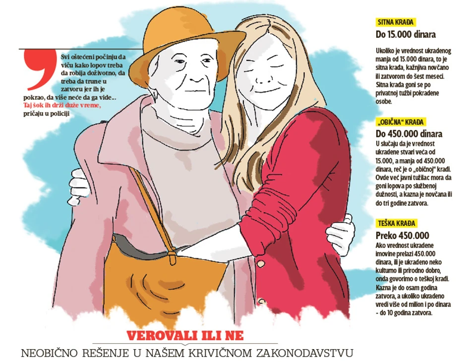 - Naš krivični zakonik za pojedina imovinska krivična dela, kao što su kućne krađe, ako je počinilac bliski rođak pokradenog, propisuje gonjenje po privatnoj tužbi. Ako se utvrdi da je lopov ili „tiper“ njemu blizak rođak, kao što je dete, brat, sestra, unuk, roditelj, tužilaštvo oštećenom predlaže da podnese tužbu protiv počinioca, jer ono nema zakonsku osnovu da ga krivično goni - navodi naš sagovornik iz pravosuđa.