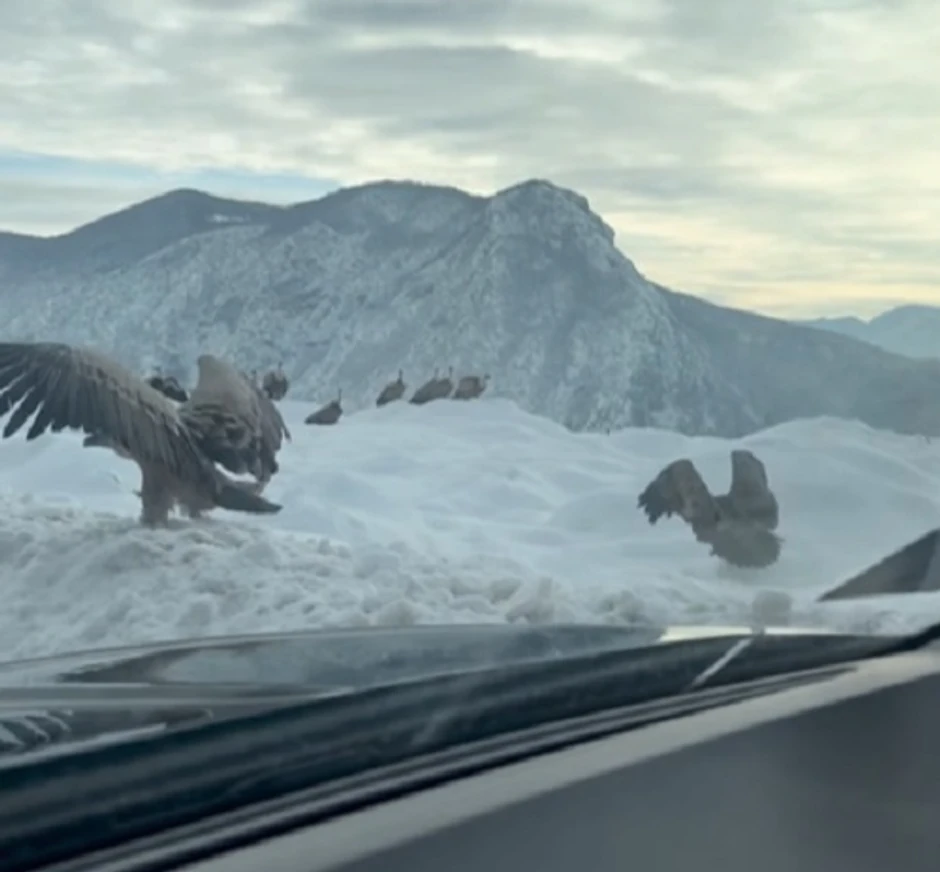 Građani, ali i svi oni koji su danas prošli kroz Pribojsku Banju, mogli su da vide nestvaran i veoma redak prizor. Naime, pored puta, na snegu, okupilo se više od deset beloglavih supova, što je iznenadilo i oduševilo prolaznike.