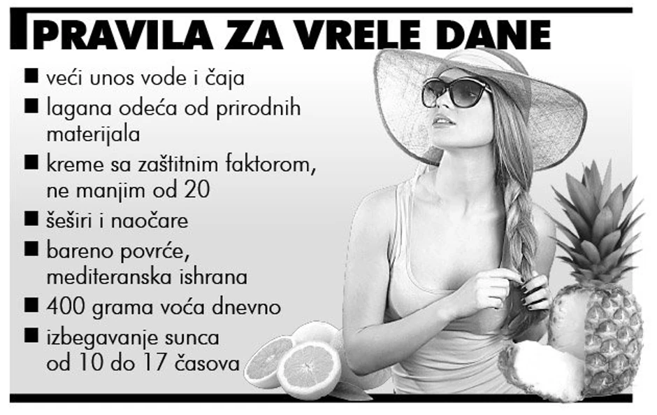 - Uvek pre izlaska treba naneti kremu sa zaštitnim faktorom na izložene delove tela, preporučuje se komotna odeća od prirodnih materijala, a na glavu treba staviti kapu ili šešir. U toku dana treba češće uzimati tečnost, najbolje blago rashlađenu vodu. Duži boravak na suncu bez zaštite može da dovede do toplotnog udara ili sunčanice - upozorava dr Macura.