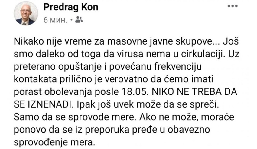 Naime, Kon je navodno u objavi na svom Fejsbuk profilu upozorio da se ne treba preterano opuštati i organizovati masovne skupove u narednom periodu.