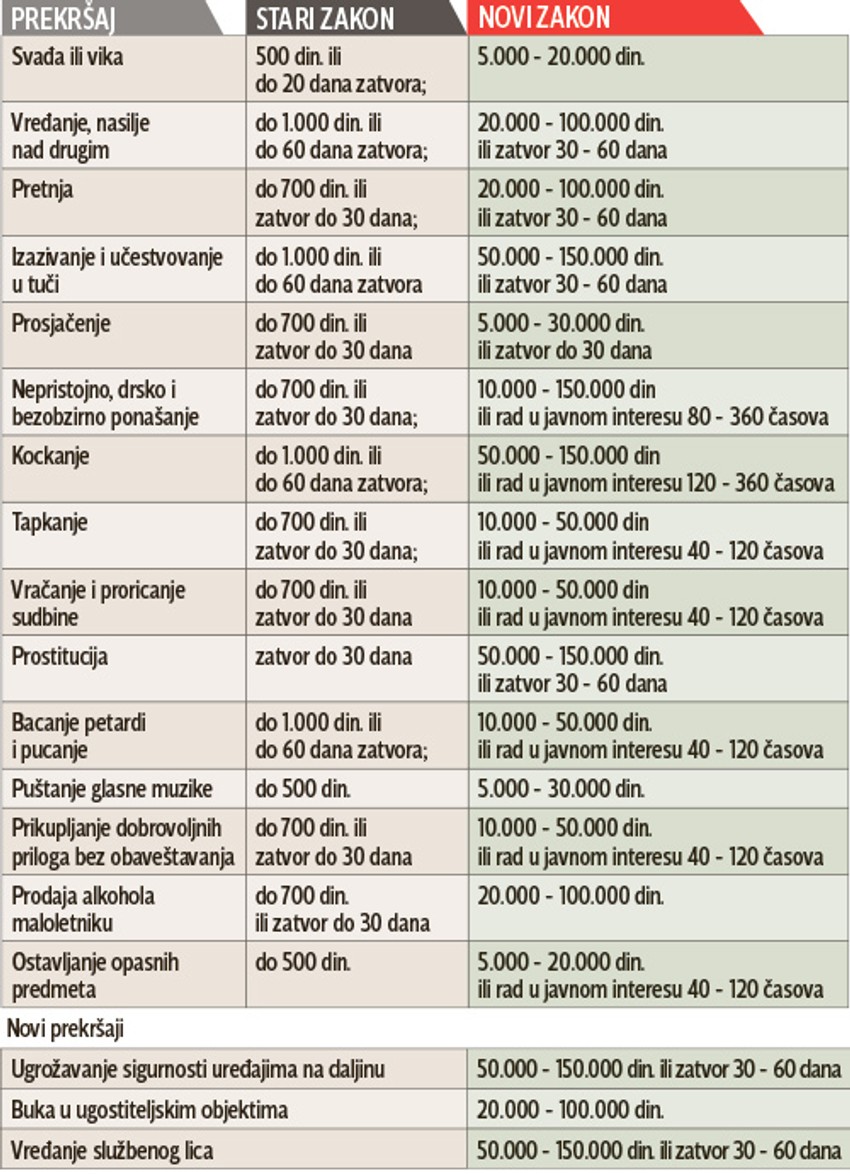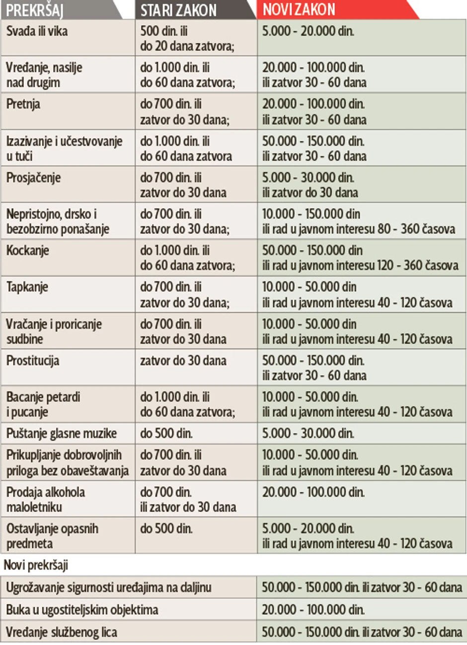 Ukinuti su skitničenje kao prekršaj i držanje opasnih životinja poput pasa bez nadzora, što je sadržano u drugim aktima. Vređanje službenog lica više nije krivično delo, već prekršaj koji može biti sankcionisan dvomesečnim zatvorom. Ukoliko, upravljajući dronom ili automobilom na daljinsko upravljanje, ugrozite sigurnost građana ili narušite javni red i mir, možete biti osuđeni i na 60 dana zatvora.