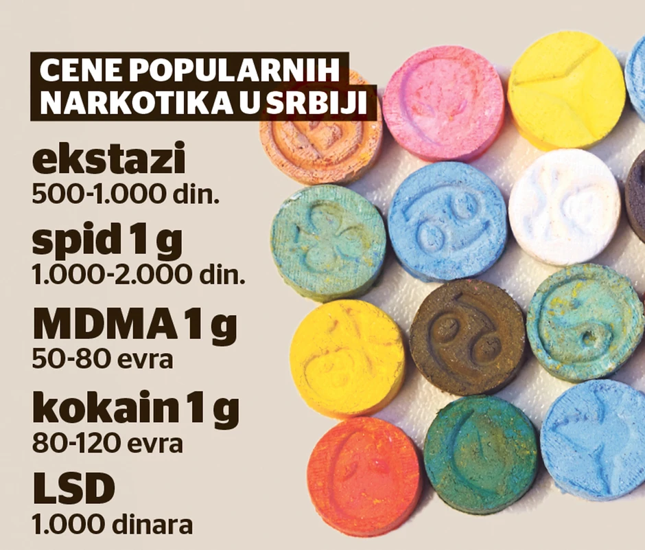 - Ulična cena ekstazija je od 500 do 1.000 dinara. Međutim, kupci i dileri se cenkaju, te ako neko uzima više ekstazija, ima popust - na primer za četiri tablete on će petu dobiti gratis, odnosno ako uzima šest tableta, dve će dobiti besplatno - objašnjava naš izvor.