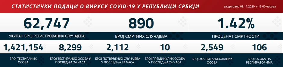 U poslednja 24 sata u Srbiji je na korona virus testirano 8.299 osoba, od čega je pozitivno 2.112. Nažalost, preminulo je još 10 ljudi.