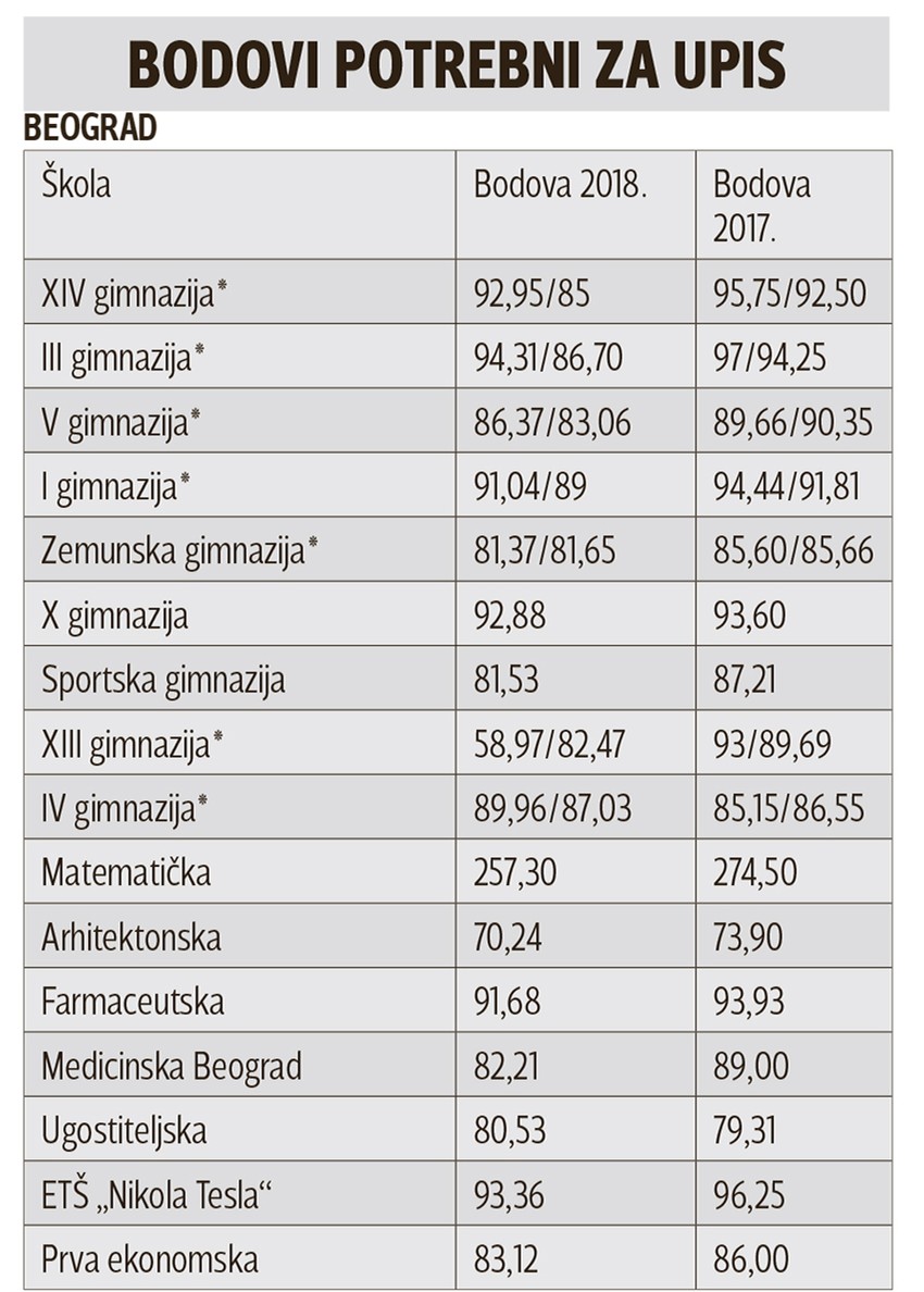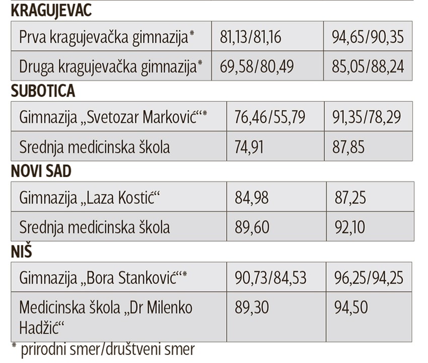 Tako je, na primer, za društveno-jezički smer Druge kragujevačke gimnazije ove godine za upis bilo potrebno 15 bodova manje u odnosu na 2017, dok su subotičku gimnaziju „Svetozar Marković“ maturanti mogli da upišu sa čak 23 poena manje.