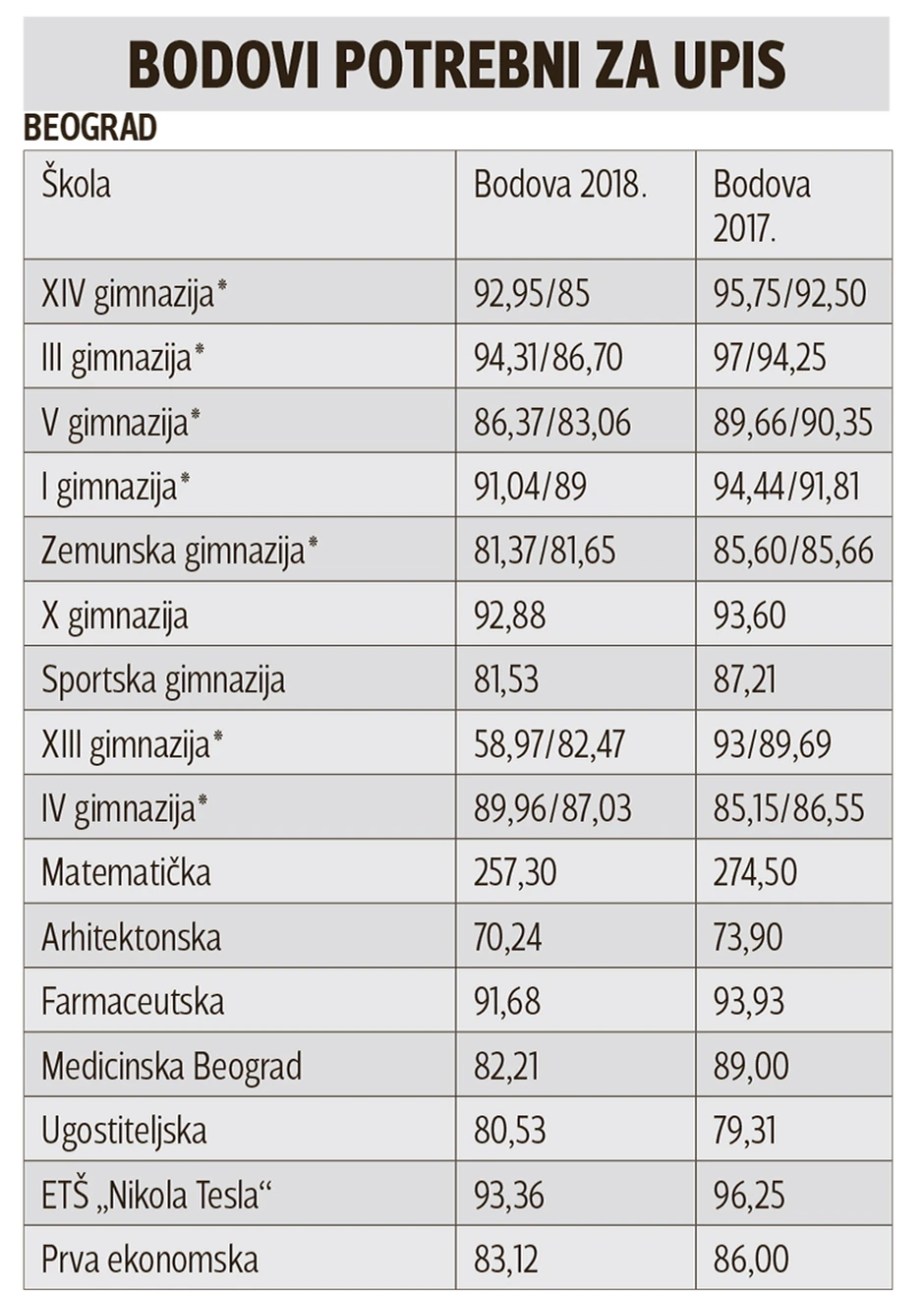 Nešto manje razlike, ali veoma upečatljive, zabeležene su u prestoničkim veoma traženim školama poput Treće i Četrnaeste gimnazije, koje su ranije bile nedostupne i vukovcima. Najneverovatniji podatak je, ipak, da je za Trinaestu beogradsku gimnaziju, koja važi za jednu od dve-tri najteže u prestonici, bila potrebna 34 boda manje. Kandidat za prirodno-matematički smer koji je najmanje poena ostvario i upisan je u ovu gimnaziju imao je samo 58,97 bodova (lane 93). Da stvar bude još čudnija, čak nisu popunjena ni sva mesta.