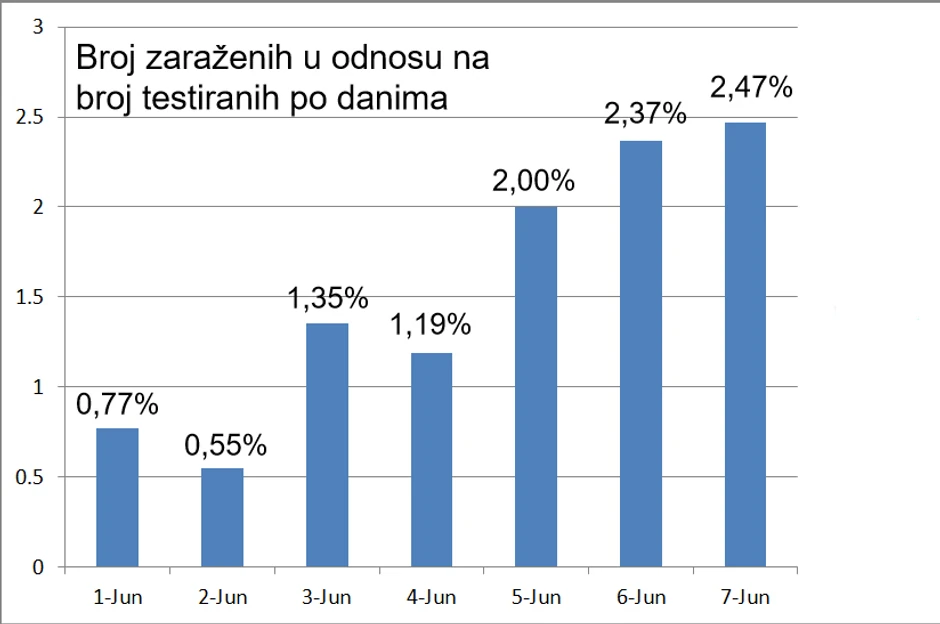 Međutim, u proteklih nedelju dana došlo je do skoro svakodnevnog rasta u broju novootkrivenih slučajeva korona virusa, pa smo od 0,55 odsto zaraženih u odnosu na broj testiranih u utorak 2. juna, došli do jučerašnjih 2,47 odsto! Ili skoro pet puta više!