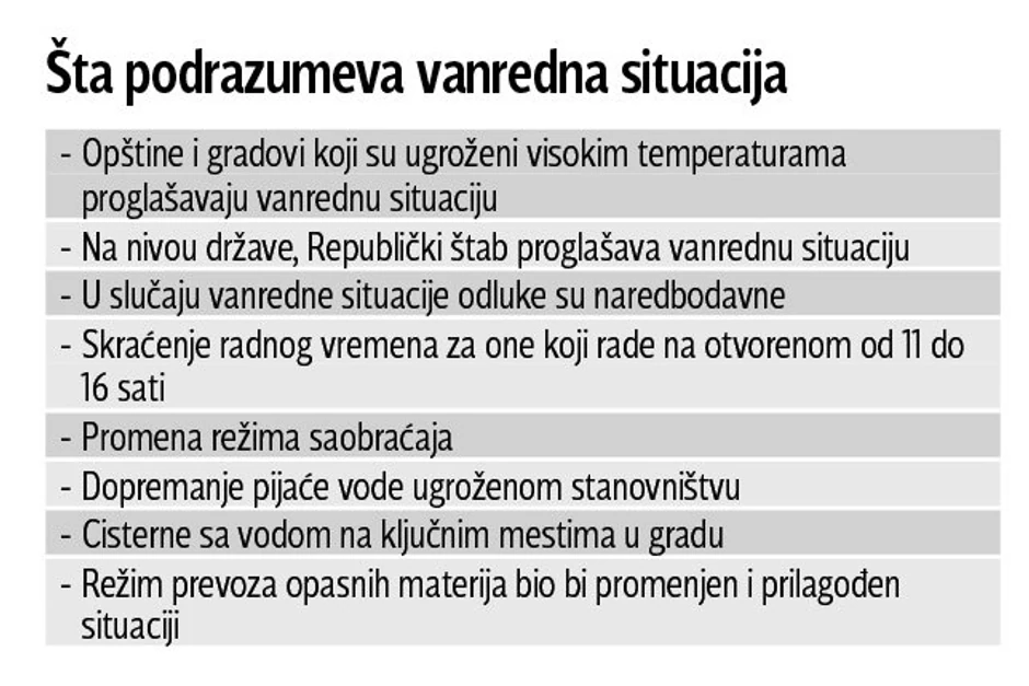 Nijedna lokalna samouprava još nije proglasila vanrednu situaciju zbog nesnosnih vrućina koje u Srbiji traju već desetak dana i građanima stvaraju posebnu nervozu. S obzirom na to da će se vreli talas nastaviti, moguće je da za par dana pojedine opštine i gradovi proglase vanrednu situaciju.