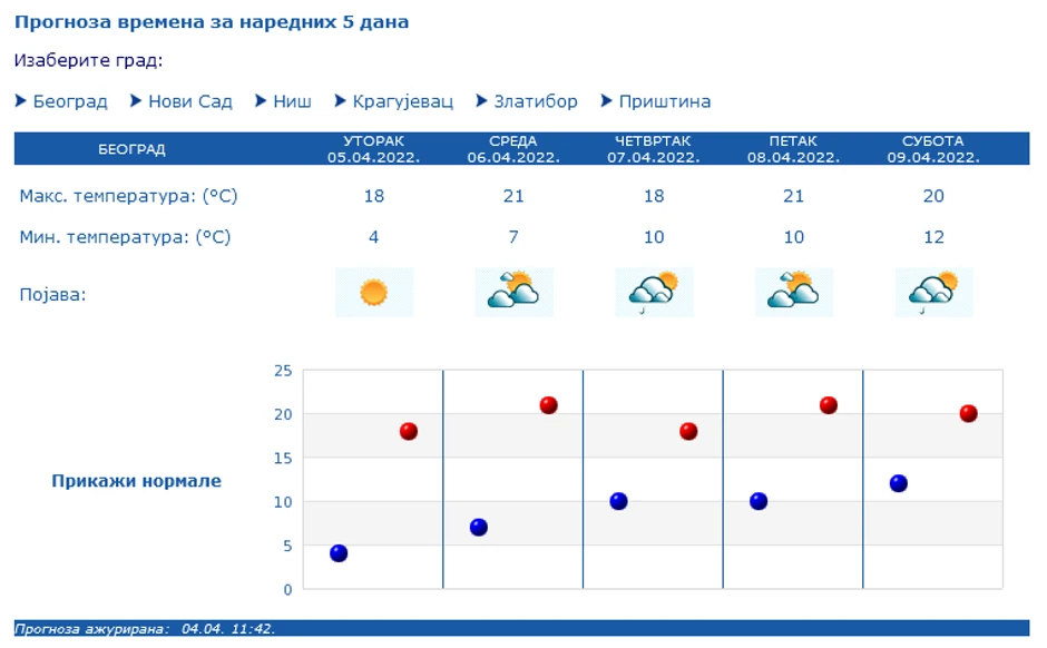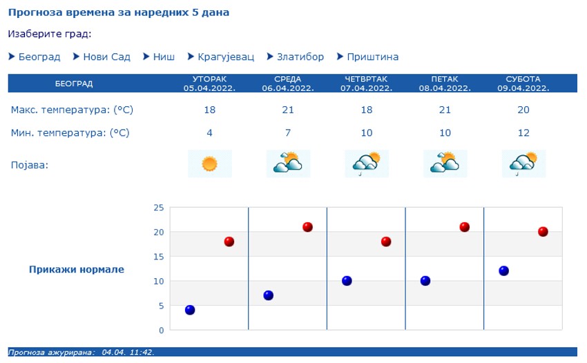 Prema prognozi za narednih sedam dana, do 12. aprila, u sredu ujutru slab prizemni mraz. Pre podne sunčano. Posle podne i uveče postepeno naoblačenje, koje će u toku noći i u četvrtak usloviti kišu i lokalne pljuskove sa grmljavinom.