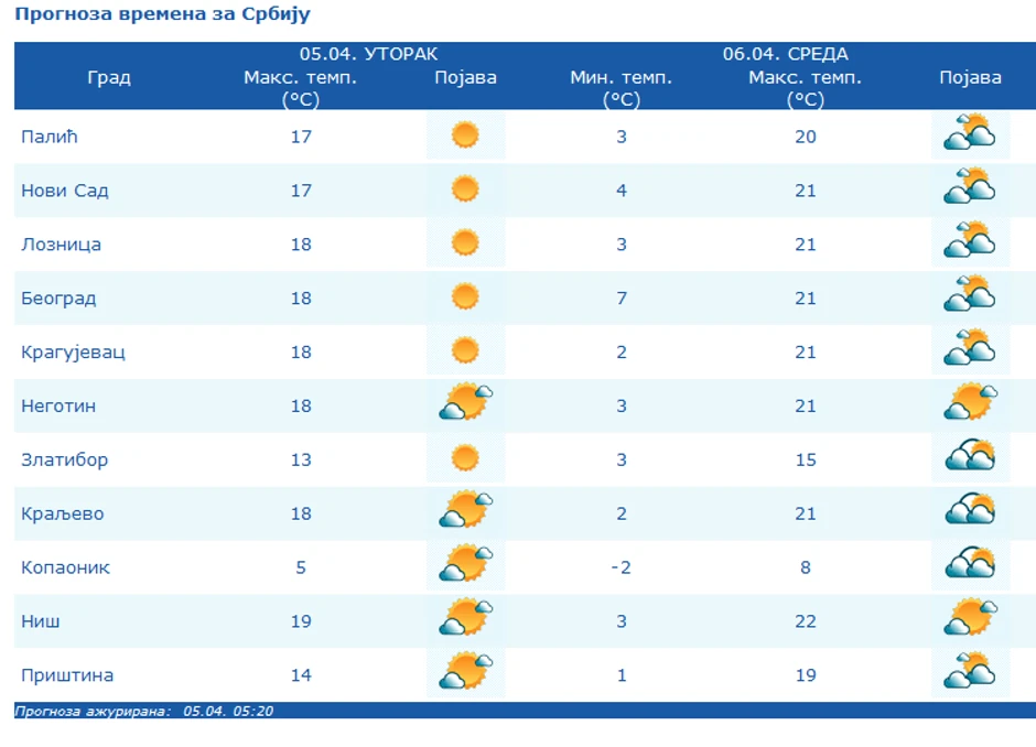 I u Beogradu ujutru hladno sa slabim prizemnim mrazem. U toku dana sunčano i tollije. Vetar slab, južni i jugozapadni. Najniža temperatura od 0 do 4, a najviša oko 18 stepeni.