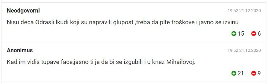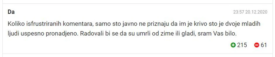 Umesto da ljudima bude drago što su naši sugrađani pronađeni, usledile su salve uvrede na dvoje mladih kako su "nesposobnjakovići" i kako ih ne treba pustiti da sami izađu iz kuće". Jer jelte, kome normalnom bi moglo da se desi da se izgubi u nedođiji planine, i kako je moguće da tu nema signala?!