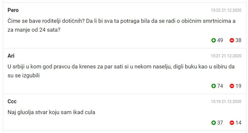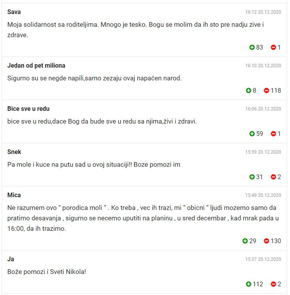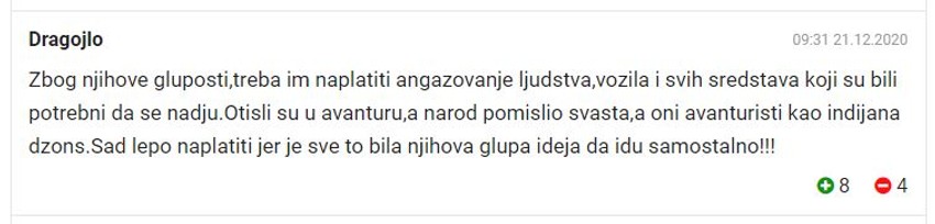 "Vrlo važna vest, dvoje nebitnih ljudi se izgubilo, jaka stvar...", E sada oboje strpati u zatvor zbog obmane celokupne javnosti", "Otišli u planinu, nisu imali signal, roditelji digli paniku... Kako neko može da se izgubi na putu u kolima? Medalja za glupost", "Tresla se gora, rodio se miš"...