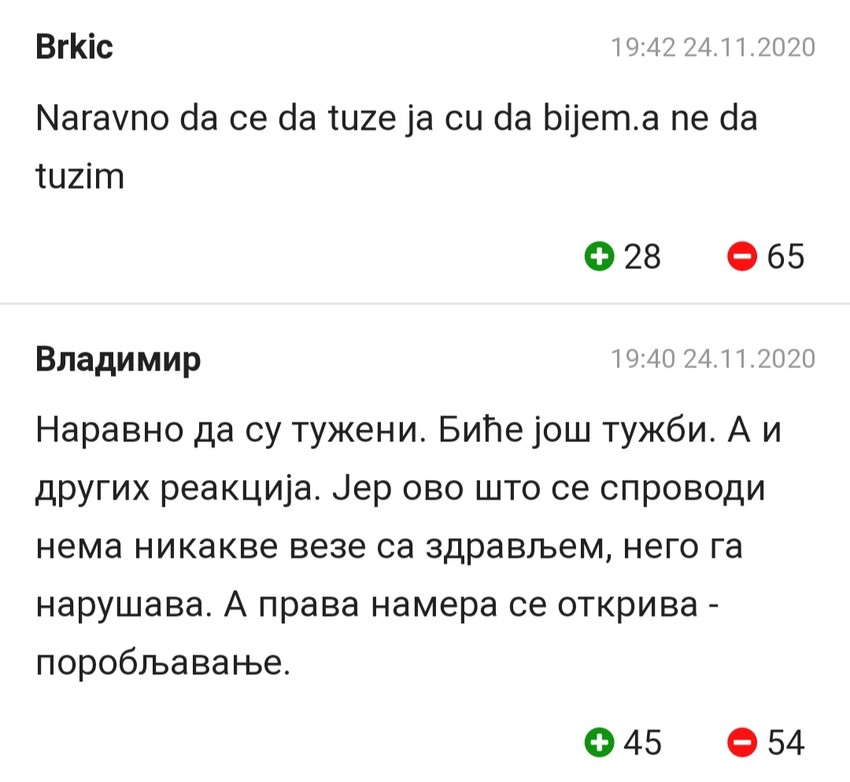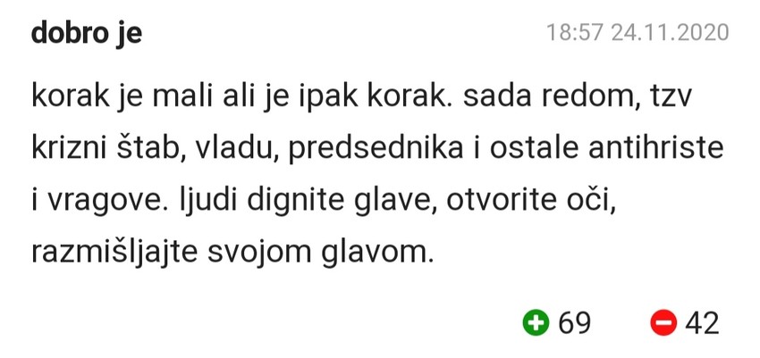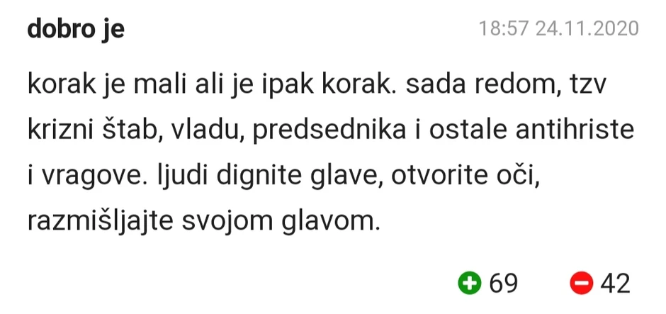 - Korak je mali, ali je ipak korak. Sada redom (tužiti, prim, aut.)- takozvani Krizni štab, Vladu, predsednika i ostale antihriste i vragove. Ljudi, dignite glavu, otvorite oči, razmišljajte svojom glavom - bio je jedan od komentara na ovu vest.