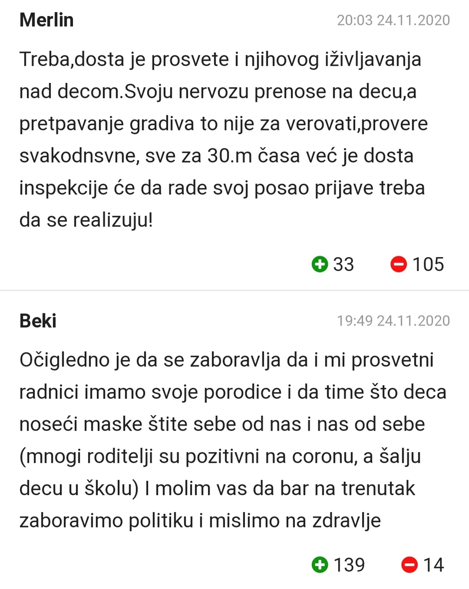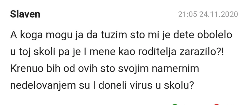 - A koga mogu ja da tužim što mi je dete bolelo u toj školi pa je i mene kao roditelja zarazilo!? Krenuo bih od ovih što su svojim namernim nedelovanjem i doneli virus u školu – glasio je jedan od komentara zabrinutih roditelja.