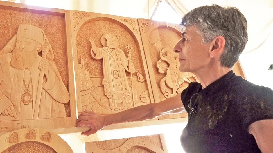 I njen Bog je vodi i kad dletom seče tisovinu, šmirgla je i glača dok u drvetu ne nastanu izrezbareni srpski sveci.