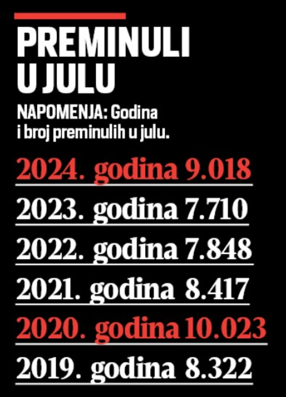 Naime, u julu ove godine je, prema podacima Republičkog zavoda za statistiku (RZS), bilo za 17 procenata više umrlih u Srbiji nego prošle godine u istom mesecu. Dok je broj umrlih u julu 2023. bio 7.710, ovog jula preminulo je 9.018 građana Srbije. Podaci o broju umrlih u avgustu ove godine se još čekaju, ali ako se u obzir uzme i to da je prošlog avgusta broj umrlih u našoj zemlji bio 7.622, sa tempom povećanja broja smrti zabeleženim od jula 2023. do jula 2024. godine, strahuje se da će broj umrlih u Srbiji u najtoplijem mesecu godine možda doći čak i do brojke od 10.000!