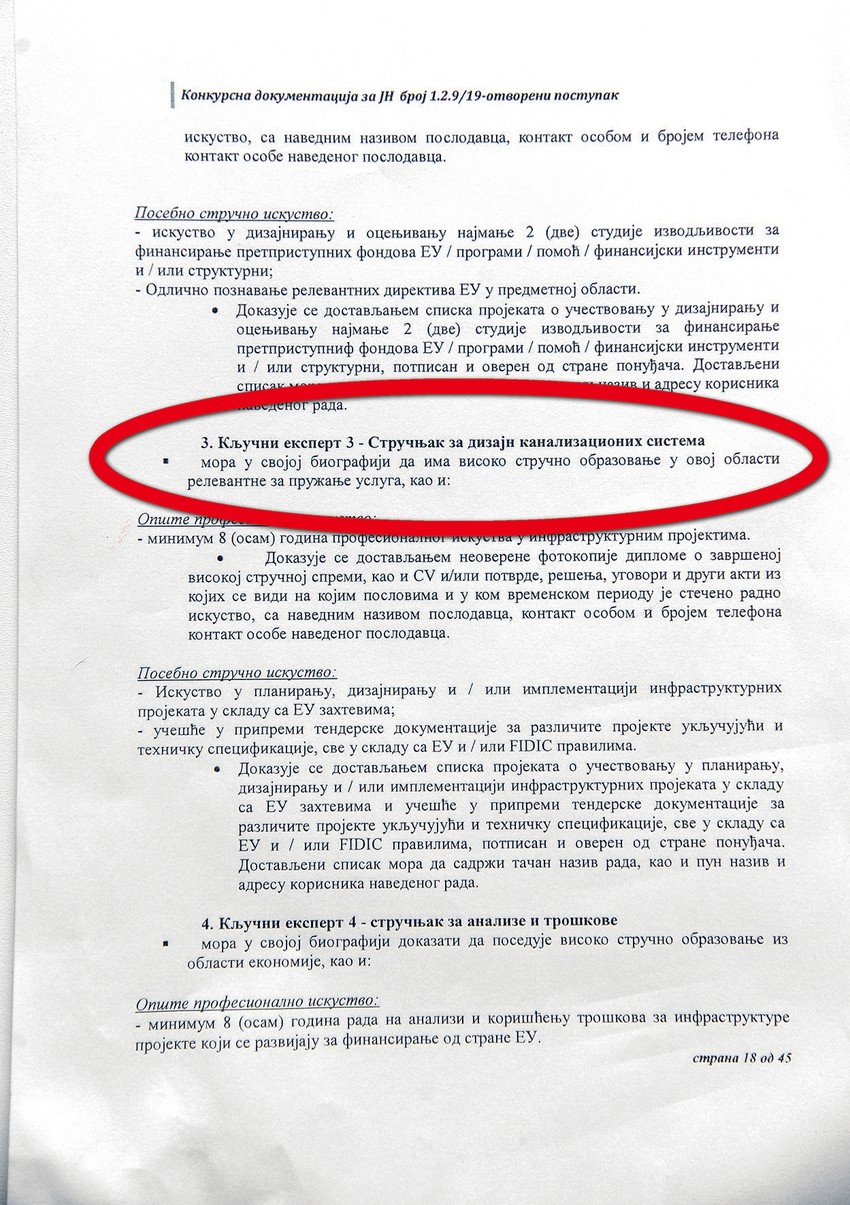 “Tahal Group B. V.” iz Novog Sada, tako stoji u zaglavlju reagovanja, tvrdi da je netačno da je Ministarstvo ekologije tražilo “dizajnera za kanalizaciju” i da takav izraz ne postoji, niti je sastavni deo dokumentacije već da je reč o projektantu za kanalizacionu mrežu. Na strani 18 konkursne dokumentacije pod tačkom 3, međutim, piše “ključni ekspert 3 - Stručnjak za dizajn kanalizacionih sistema, koji mora da ima iskustvo u planiranju i dizajniranju”. Taj uslov bio zbunjujući za ponuđače pa su tražili razjašnjenje, smatrajući da je greška. Iz odgovora tenderske komisije se vidi da nije: “Ukazujemo zainteresovanom da nije došlo do greške, već da na zahteve naručilaca treba da odgovore eksperti sa iskustvom u dizajniranju”.