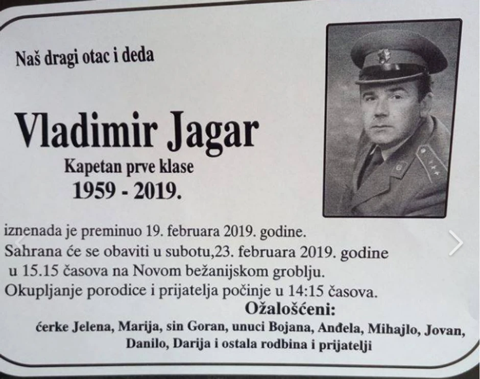 Vladimir Jagar (1959-2019), kapetan prve klase, iznenada je preminuo 19. februara, objavila je njegova porodica. On će biti sahranjen u subotu na Novom bežanijskom groblju.