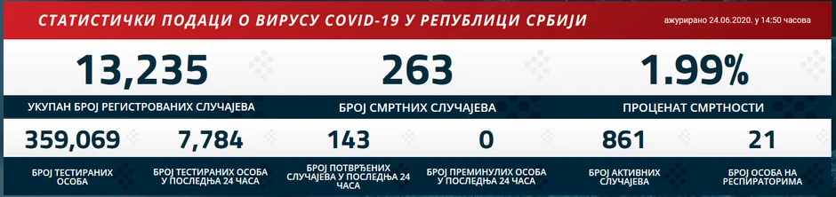 Sada u Srbiji, prema poslednjim podacima sa sajta covid 19, imamo 861 aktivan slučaj zaraze, a od početka epidemije ukupno registrovanih slučajeva je 13.235.