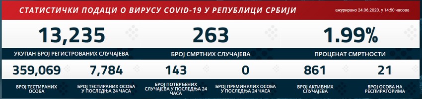 U protekla 24 sata u Srbiji je na korona virus testirano 7.784 osoba, registrovano je 143 novozaraženih, a preminulih nije bilo.