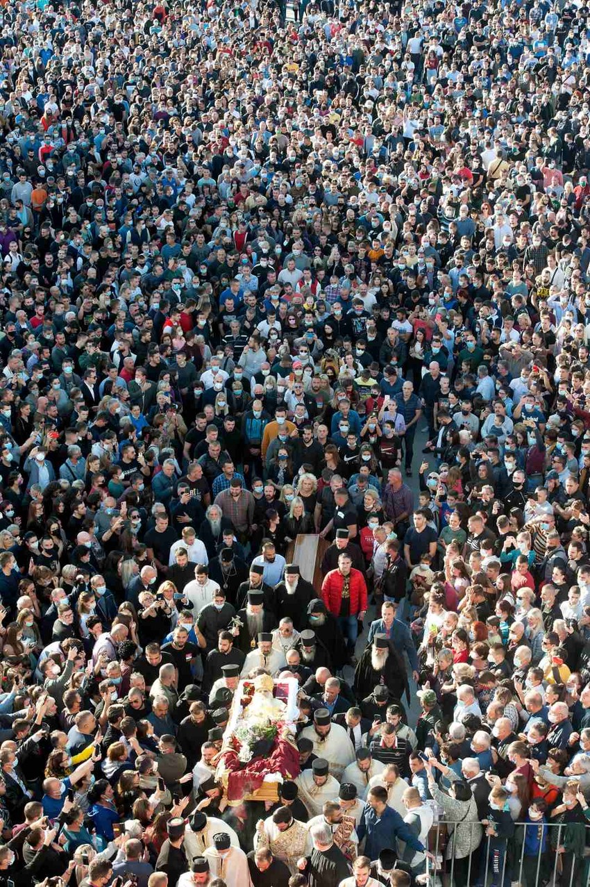 Sveštenstvo, verni narod i građani, među kojima i majke sa malom decom u naručju, u mimohodu kraj odra celivaju i dodiruju kovčeg preminulog mitropolita.