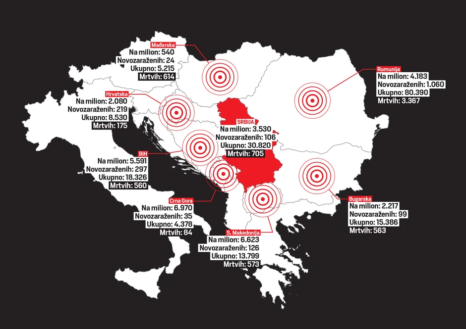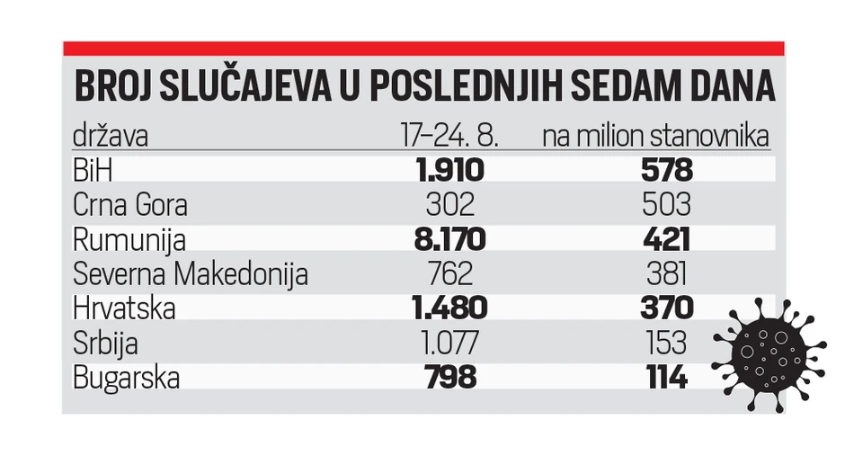 U poslednja 24 sata u Srbiji je potvrđeno 154 novozaraženih (juče 106) od 9.932 testiranih, dok su četiri osobe preminule. I dok deluje da se epidemiološka situacija polako smiruje u našoj zemlji, u susedstvu se rasplamsava. Najteža je u Rumuniji, gde je prema poslednjem preseku potvrđeno 1.060 novoobolelih, a preminulo je 58 osoba. Slede Bosna i Hercegovina sa 297 novih slučajeva i 13 smrtnih ishoda, dok je u Hrvatskoj registrovano 219 novoobolelih i dve preminule osobe. U Bugarskoj je preminulo čak 18 ljudi, što je najveći broj umrlih u jednom danu od početka pandemije, a potvrđeno je 99 novih slučajeva zaraze.