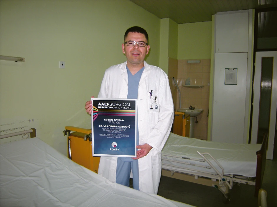 Iako je tek na specijalizaciji iz opšte hirurgije, doktor Vladimir Davidović (34), iz Opšte bolnice u Kikindi, postigao je veliki uspeh na međunarodnom kongresu. Osvojio je prvu nagradu iz svoje specijalizacije na međunarodnom kongresu u Barseloni, koji je održan krajem avgusta 2016. godine.