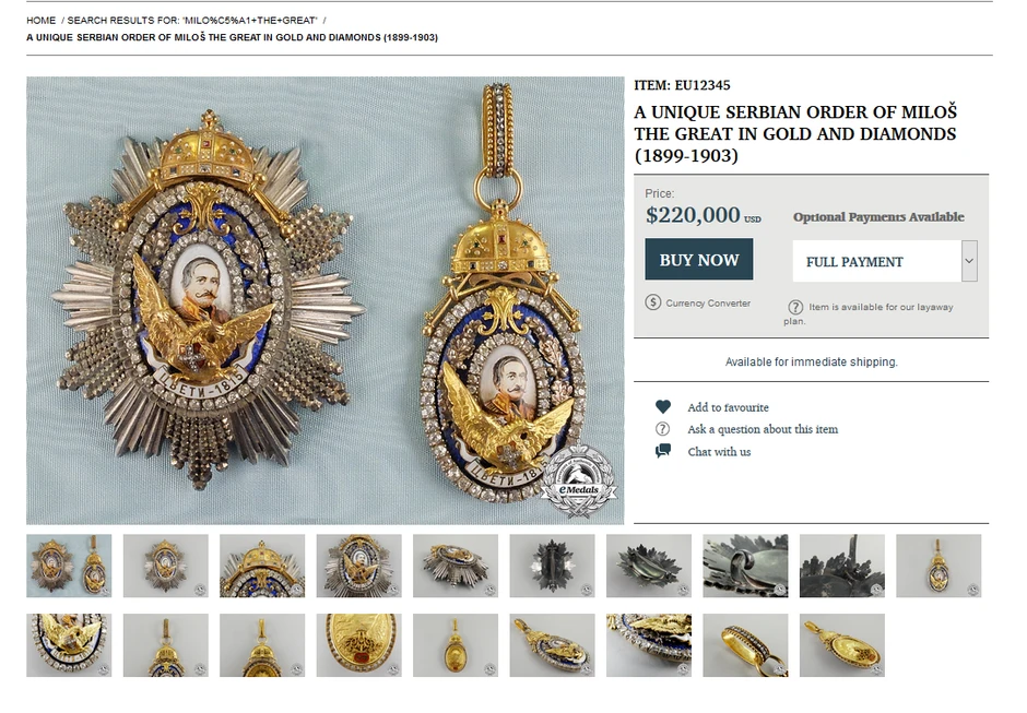 Orden i zvezda Miloša Velikog u zlatu i dijamantima od 220.00 dolara, pečat kraljice Drage Mašin od 9.800 dolara, puška kralja Milana Obrenovića od 4.500 funti samo su neki od ukradenih predmeta neprocenjive vrednosti za srpski narod, a koje prodaju na sajtovima stranih aukcijskih kuća.