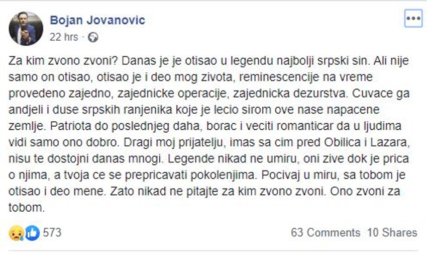 - Jer je njegova dobrota i čojstvo nadvladali su sve sile zla - poruka je na Tviteru korisnice @trag_u_beskraju ,kojoj će od sada, kaže, ”Marš na Drinu” zauvek biti pomisao na još jednog junaka.