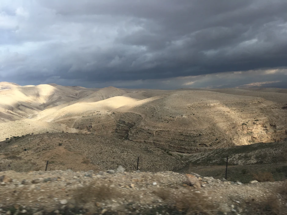 Puca na Jordan, stigli smo tačno u periodu kada se Sunce spušta, uz kovitlac krivina i prevoja kroz pustinju nas je i mreža obavestila da smo čak ušli i u jordansku mrežu što se tiče pokrivenosti.