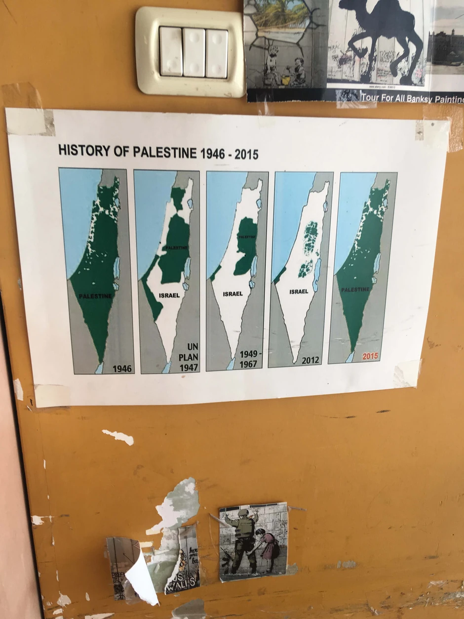 I hvala Bogu na tome, jer ne volim kad me neko gnjavi da mi napiše ime na čaši. Momčić koji radi sa ćaletom nas je uslužio, na zidu je bila mapa Izraela i Palestine, uz sva kretanja teritorije za kojom Palestinci pate.