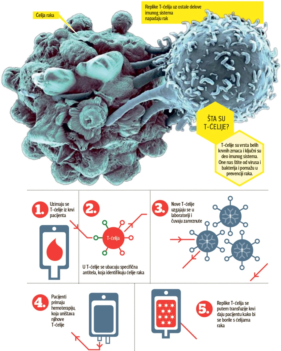 Prof. dr Vladimir Kovčin, onkolog KBC „Bežanijska kosa“, kaže za „Blic“ da se jedan oblik terapije T-limfocitima već primenjuje, ali da je novina u unapređenoj sposobnosti prepoznavanja ćelija raka.
