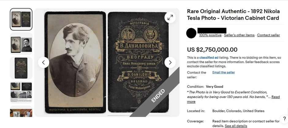 Vlasnik fotografije jednog od najvećih naučnika svih vremena u opisu oglasa napisao je da ju je 2016. godine otkupio od jednog antikvara iz Ilinoisa nadomak Čikaga koji je tvrdio da je na njoj Nikola Tesla ili njegov rođeni brat Dane.