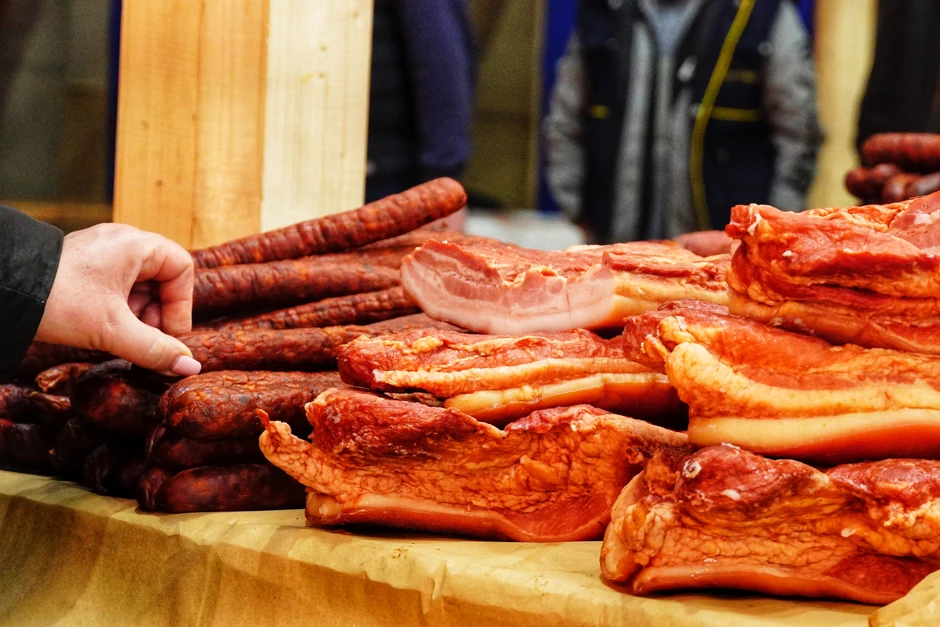 Predstavnica mesare "Burjan" Marija Orsić kaže da je ova firma kao i uvek izložila više vrsta slanine - od barene preko pančete do domaće, a tu si kobasice, kulen i mnoge druge prerađevine.