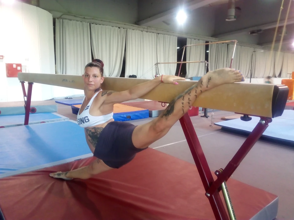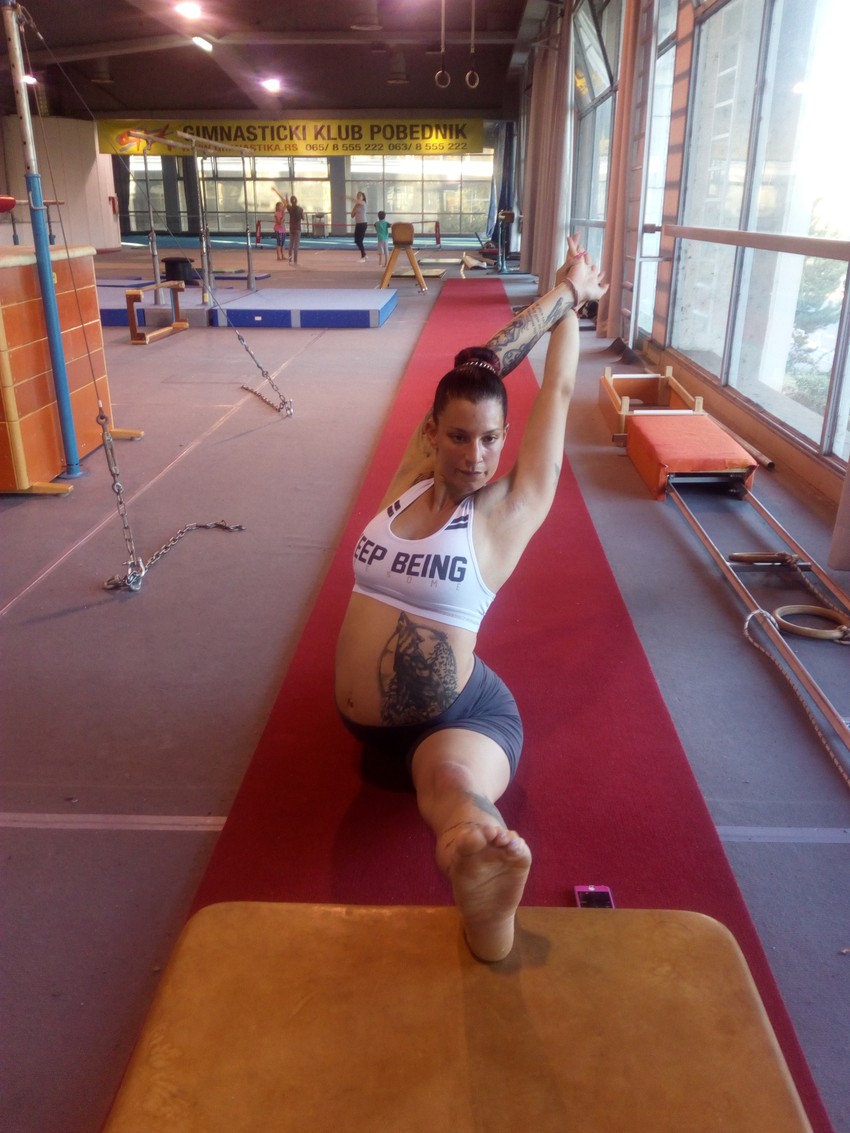 Trudna mama dovela je sina na gimnastiku, dečak je otišao sa svojom ekipom, a onda se i ona presvukla u sportsku odeću i započela svoj trening – u sedmom mesecu trudnoće, posle početnog zagrevanja, usledile su špage, zvezda, stoj na rukama...